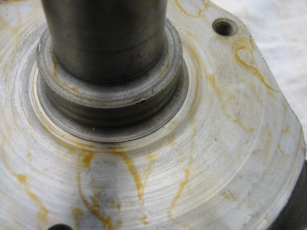 Die Laufläche für den Simmering ist rillig eingelaufen. Der Sitz von der Lagerschale ist auch eingelaufen. Das ist übrigends die Unterseite der Radnabe. Ich vermute, da ist im früheren Leben dieses Achsschenkels, jemand mit kaputen Radlager + "Wellendichtring", oder defektem Stoßdämpfer rumgefahren.